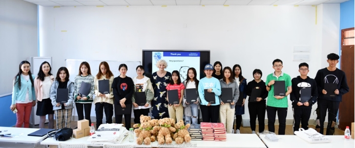 After a short interaction, Professor Harris posed four topics to students: What we will learn, Why we learn, How to learn, and How to think about studying. She introduced the background of English-speaking countries, highlighted the importance of learning English and shared the methods of adapting to overseas life. Furthermore, Professor Harris mentioned that studying, a process to acquire knowledge, improve skills and build positive learning attitude, is motivated by the interest and desire for success. Thus, automatic learning is very important.