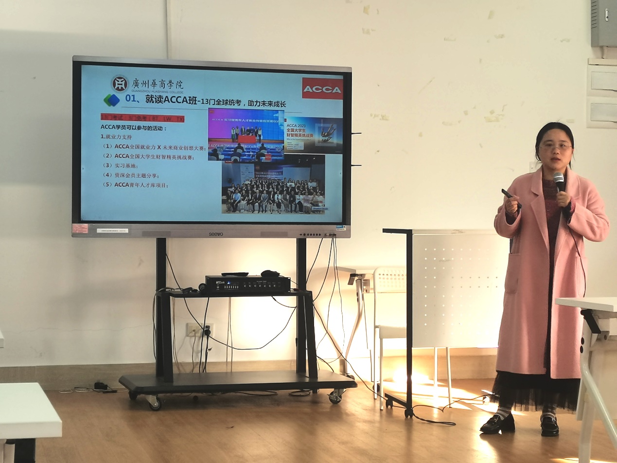 In order to help the 2023 ACCA International Certified Public Accountant class students gain a deeper understanding of the importance of the International Certified Public Accountant certificate in their careers, and allow first-year students to prepare for the qualification examination early and make career and study abroad plans, on December 28, the International College of Guangzhou Huashang University invited ACCA outstanding teacher Chen Mengmeng to hold an ACCA International Certified Public Accountant class professional exchange and sharing meeting in Room 405 of Qizhi Building. The 2023 International Accounting ACCA class students attended the meeting.
