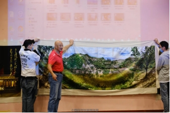 The lecture started by inviting the audience to view the scrolls closely on the stage to get a clearly detailed understand of these works. Witnessing the exquisite and delicate paintings, students were amazed by the craftsmanship of the artist. Mr. Yang introduced the historical events and significance represented by the works: Journey of Friendship, Footprints-From Liangjiahe to Zhongnanhai, and Monument to the People’s Heroes. In addition, he mentioned that these paintings integrated traditional embroidery techniques with his photographic works. To assist learning, two videos were shown to help students better understand the painstaking photography process and the unique creating process of the scrolls. He hoped that students could appreciate the cultural atmosphere and the fighting spirit of the revolutionist through his speech.