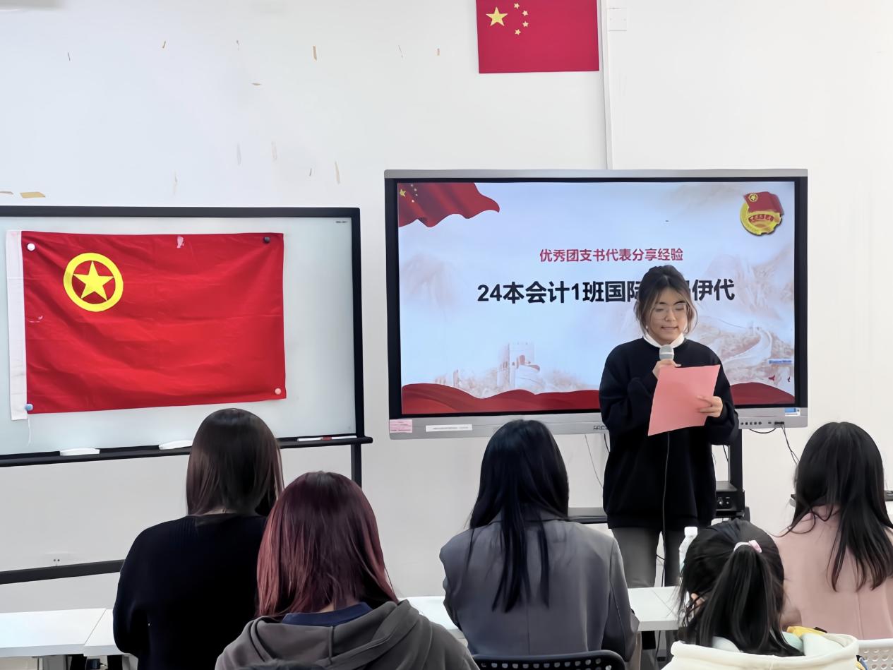 接着,优秀作品团支书代表24级会计学(国际班)1班的玛伊代同学上台分享经验。她首先对自己代表班级做本次分享表示荣幸,讲到此次拼贴画作品灵感的来源,作品汇集了班级同学对梦想的理解与看法,以及个人对理想信念的追求。她提到此次拼贴画作品征集活动为班级同学营造了良好的学习氛围,搭建起互相之间进一步沟通交流的桥梁,提升了班集体荣誉感,以及个人对梦想的深入思考与认识,希望所有同学都能通过本次活动以梦为马,逐梦启航。