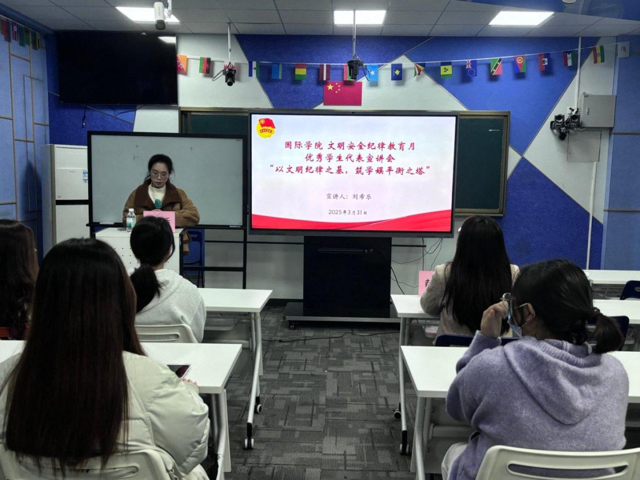 为充分发挥优秀学子示范引领作用,营造见贤思齐的优良学风,2024年3月31日下午,太阳网集团tcy8722在启智楼401举办了主题为“以文明纪律之基,筑学娱平衡之塔”文明安全纪律教育月优秀学生典型宣讲会(一)。本次宣讲会主讲人为太阳网集团tcy87222023级国际经济与贸易国际班刘希乐同学。太阳网集团tcy8722团委书记郝自秀老师主持会议,来自太阳网集团tcy8722、健康医学院、会计学院、外国语学院等40余名学生参加了本次宣讲会。