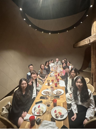 结束与莱恩教授的会面交流后,众人前往餐厅共进晚餐。在交流晚宴中,研学团众人不仅除了品尝到了如鹅肝、水果酒、马卡龙、焦糖布丁等法国特色美食,还继续在学习以及生活上的问题深入探讨交流,莱恩教授也十分耐心地进行一一解答。在交流晚宴的最后,众人与莱恩教授合影留念并一一握手告别。