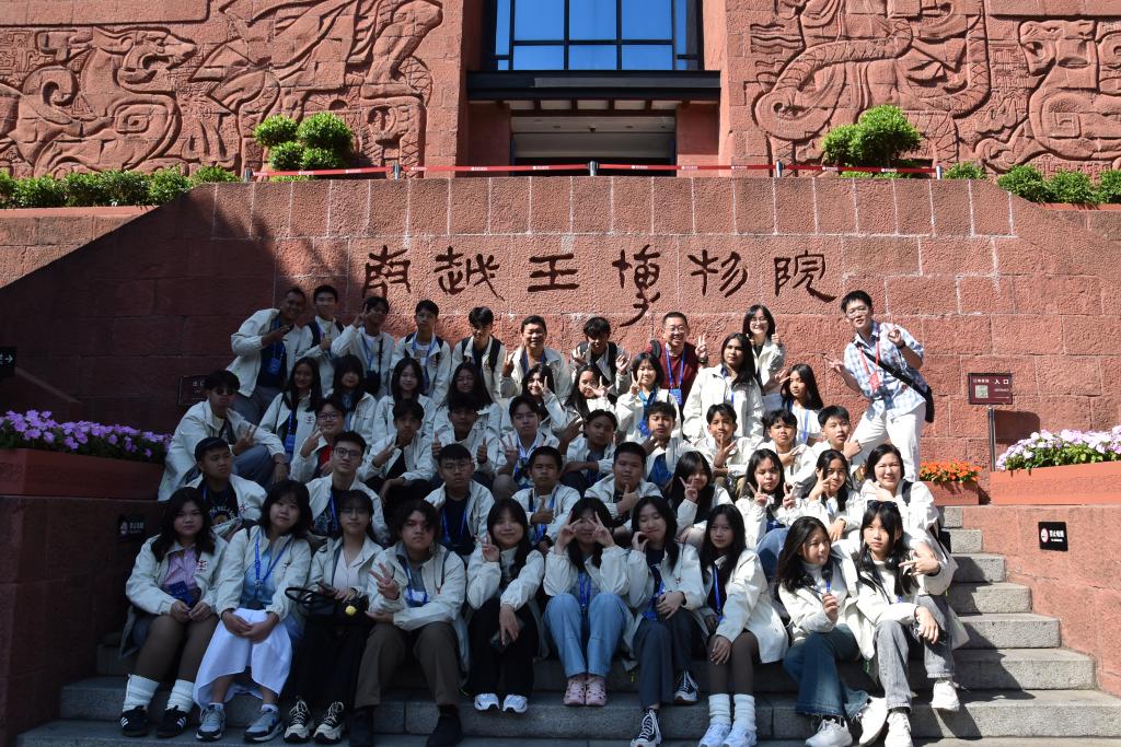 首先,他们抵达了广州南越王博物院的王墓展区,这座博物院承载了广州千年历史,横跨秦汉两朝。在讲解员的带领下,师生们在王墓区和展馆之间穿梭,通过欣赏彩色汉墓、汉代玉器、青铜器,深入了解了玉器文化以及中原文化与岭南文化的交汇融合;通过欣赏船纹铜提筒,领略了岭南文化元素里中西文化交融的特点及对外贸易的繁盛;通过犀角形玉杯的精湛工艺,体会到岭南人民在传统手工艺传承中的努力和贡献。这里近1000件展品,每一件展品都诉说着古老的故事,讲述着广州千年商都的历史。