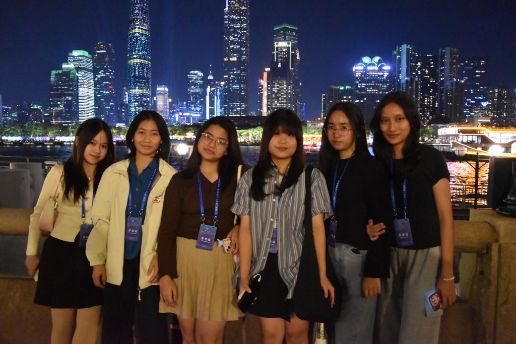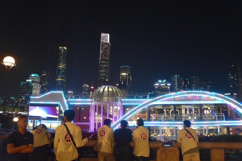 夜幕降临,师生们登上了游船,开启了欣赏珠江夜景的旅程,随着游船的徐徐前行,珠江两岸的风景就像卷轴画一般缓缓铺开,广州塔灯光璀璨,与周围的建筑群交相辉映,构成了一幅美丽的画卷,珠江上的桥梁如彩虹般横跨江面,两岸的灯光倒映在水中,宛如梦境。此时恰逢广州2024国际灯光节期间,500多架无人机在空中飞舞,组成了五羊、鲤鱼跳龙门等图案。师生们在惊叹的同时,对中国的科技发展、人民的美好生活有了更深刻的印象和感触。