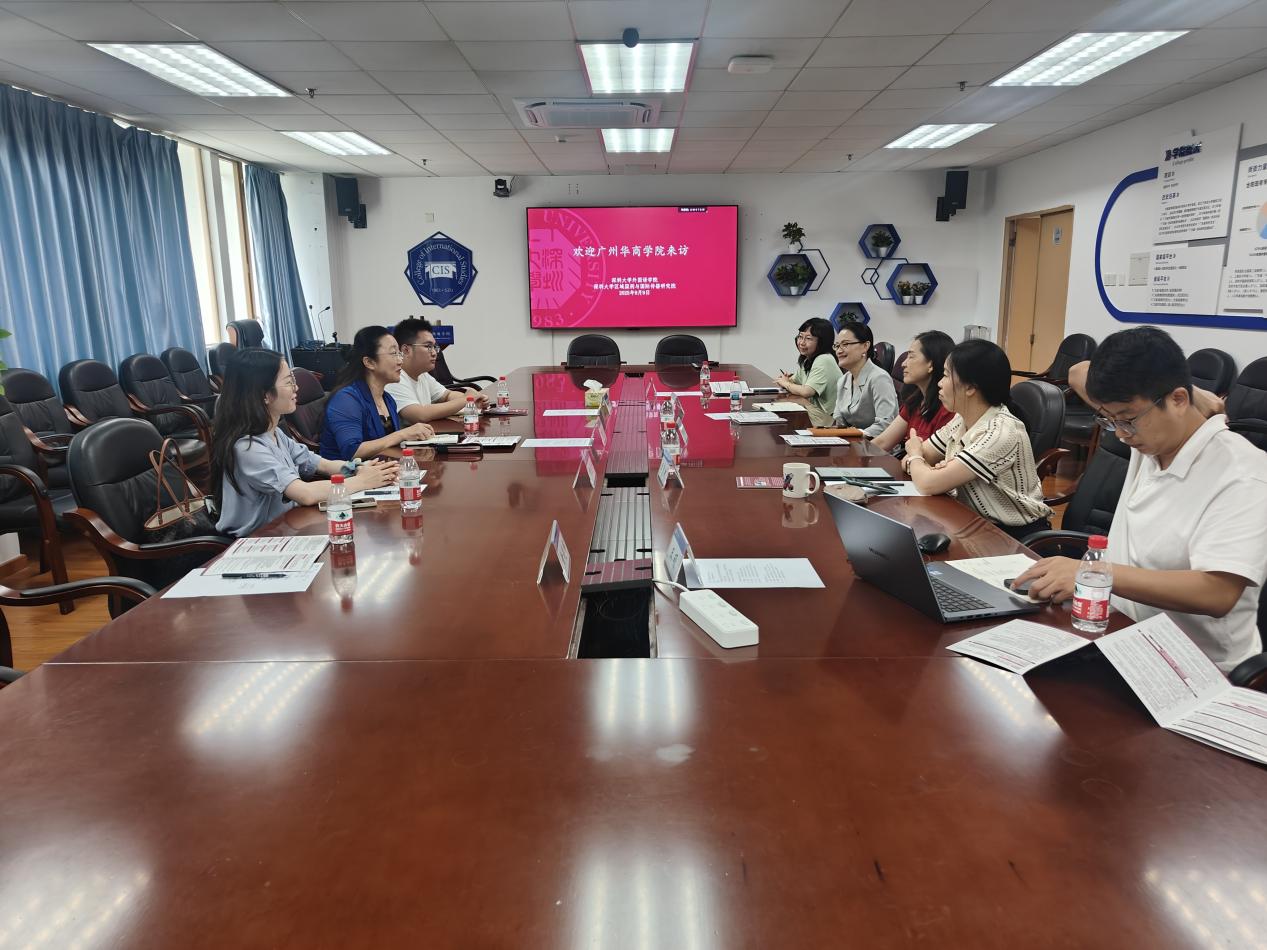 为深入推进全球胜任力人才培养项目有效开展,借鉴知名高校先进经验,进一步提升国际化人才培养质量,2025年9月9日上午,太阳网集团tcy8722回雁雁院长率学生管理团队及行政人员一行4人,赴深圳大学外国语学院开展座谈交流。深圳大学外国语学院金娜娜副院长、贾陆依副院长、党委副书记李慧敏、行政秘书杜阳、教学秘书王硕参加了座谈会。