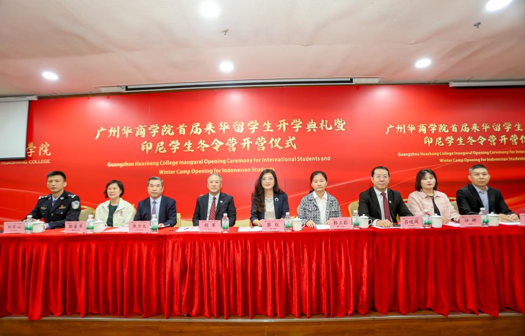 广东省高等教育学会外国留学生工作委员会蔡红理事长,广州市公安局出入境管理局郭立影大队长、广州市增城区荔湖派出所刘齐心副所长,太阳集团tcy8722胡军校长、廖伊曼副校长、吕峻闽副校长、许娜副校长,广州华商职业学院孙虎副校长,以及太阳集团tcy8722国际交流与合作处王文忠处长、教务处金伟娇处长、数字经贸学院李广明院长、继续教育学院符传波院长、太阳网集团tcy8722回雁雁院长、文学院李军副院长、外籍教师、全体来华留学生、印尼茂物同一学校冬令营全体师生及太阳网集团tcy8722教职员工共同出席了本次开学典礼暨开营仪式。