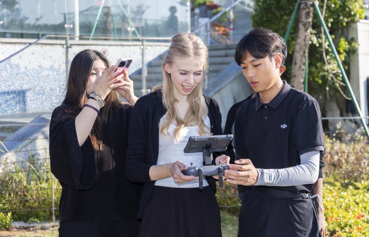 在随后的户外无人机飞行体验中,留学生们在大疆专业人员的指导下亲身体验飞行。从平稳起飞、空中悬停到精准降落,他们逐步掌握了基础操控技巧,并尝试运用航拍视角捕捉独特风景。