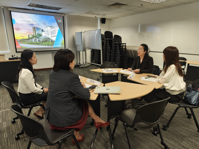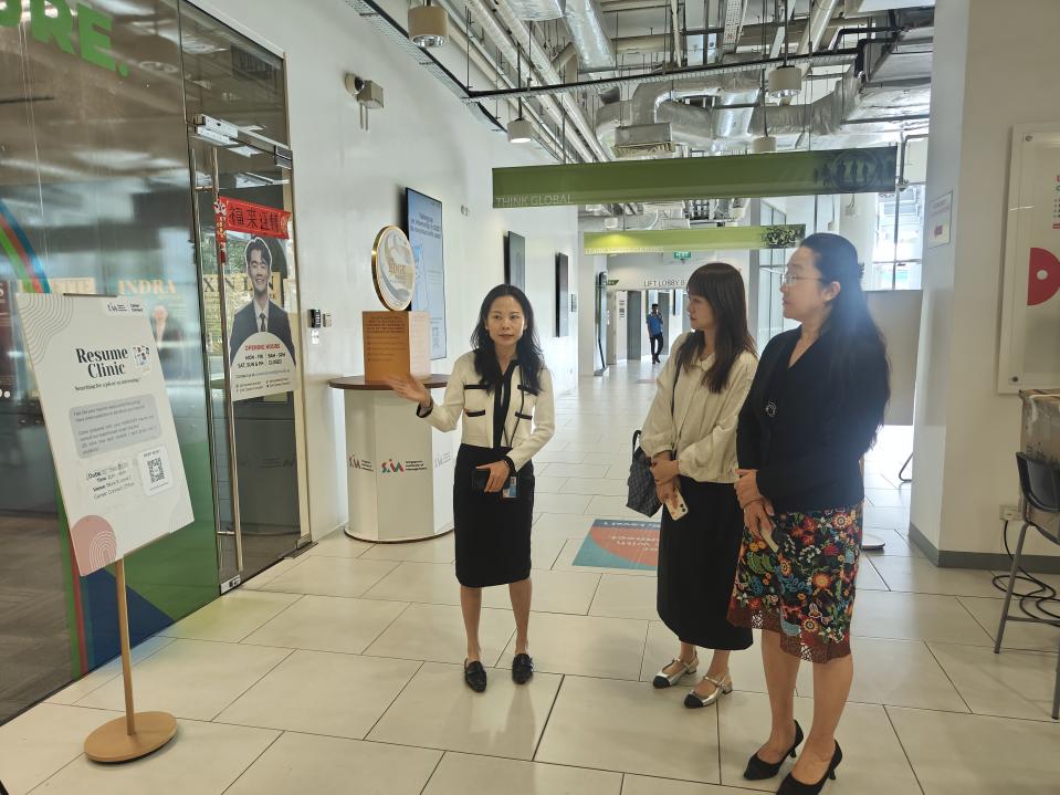 在庄家瑜主任的陪同下,回雁雁院长一行实地参观了新加坡管理学院校园,并就校园多元文化氛围营造、学生职业规划辅导体系建设,以及多校合作模式的协调与服务机制等方面进行了深入交流。