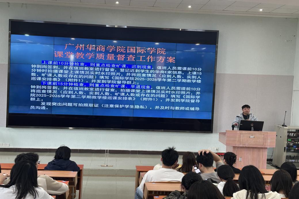 随后,学工负责人吴锦涛对《太阳网集团tcy8722课堂教学质量督查工作方案》《太阳网集团tcy8722学生请假制度》进行了系统阐释与全面部署。他指出,学院已正式组建以回雁雁院长为组长的课堂教学质量督查工作小组,构建起“院领导、辅导员、教学秘书、班主任、学生党员志愿者”五位一体协同巡查机制,实现教学时段与教学区域一周全覆盖督查。在学生请假管理方面,吴锦涛再次强调提前申请、紧急补报、按时销假等核心管理要求,明确学院将针对旷课、迟到等行为构建常态化、精细化的重点帮扶机制,凭借制度化、规范化的举措严格把控学生课堂行为管理,筑牢学院学风建设的基础。