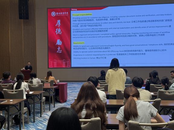 为了让更多华商优秀学子踏入国际化企业、开启职业生涯,2026年3月18日,汇丰环球专场招聘会在国际会议展览中心华商玉堂举行。汇丰环球客户尽职调查部助理副总裁Catherine,客户尽职调查部经理Angela、Carmen,企业客户尽职调查部助理副总裁Timmy、Sai,企业客户尽职调查部经理Michael,以及人力资源部招聘经理Phoebe、Sylvia、Frankie出席活动。嘉宾们详细介绍了汇丰环球的发展历程、核心业务布局、客户尽职调查板块的工作内容、校园招聘岗位需求、职业晋升通道、企业培训体系及弹性福利制度等内容。现场同学认真聆听、积极互动,对汇丰环球的业务版图有了更深入的了解。