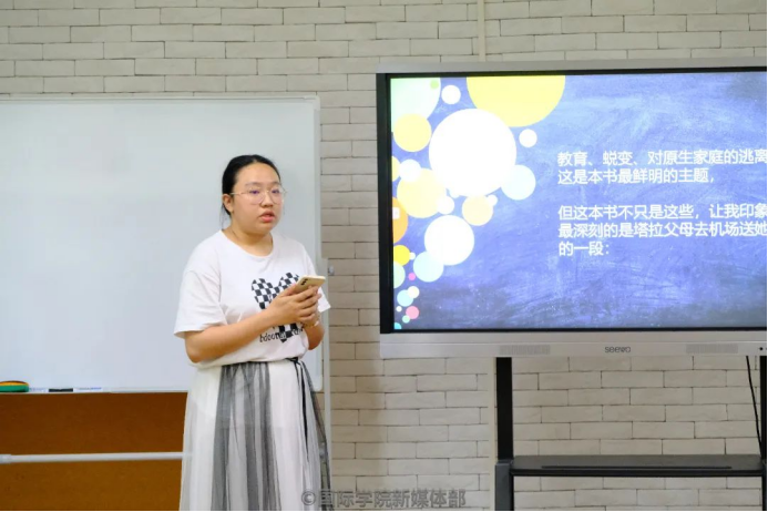 接着,来自2022级会计学国际班的何美璇同学分享了书籍《你当像鸟飞往你的山》。何同学指出本书最鲜明的主题是教育、蜕变以及对原生家庭的逃离,并讲述了主人公塔拉的父母送她去机场的故事。通过阅读此书,她领悟到子女和父母的关系就像缠绕在一起的藤蔓,彼此交织,相互影响。