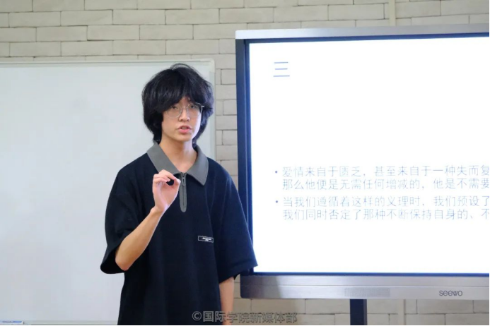 随后,来自2022级英语国际班的鲁昀致同学分享了小说《爱的艺术》。他从哲学的层面解读了爱的艺术;并指出该书将人格爱情与生理激情相对立,而忽略了伦理性。鲁同学提到,爱情是一种个人体验,非他人能够给与;如果只是寄希望于他人,想从中间接获取恋爱的行动秘诀,那么此书可能会让你大失所望、空手而归。