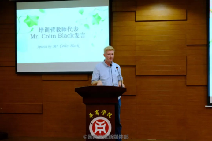接着,Mr.Colin作为培训营教师代表进行发言。他表示,同学们在培训营课堂的表现都很优秀,值得表扬。他希望同学们在今后的学习生活中继续自信大胆地表现自己、勇敢尝试。为了本次汇演的精彩呈现,同学们做了精心充足的准备,在此他预祝同学们今晚演出成功!