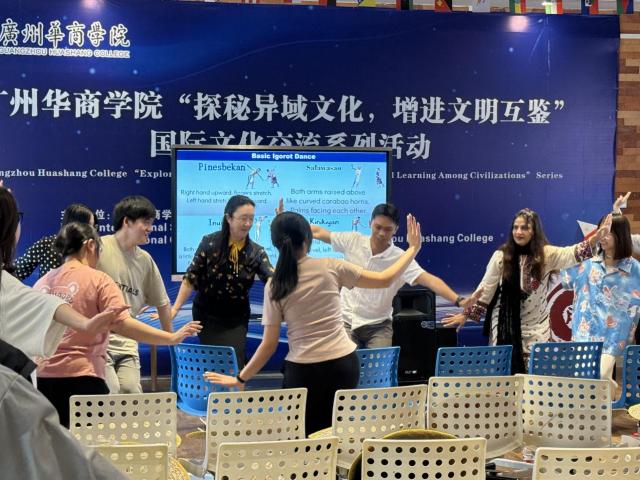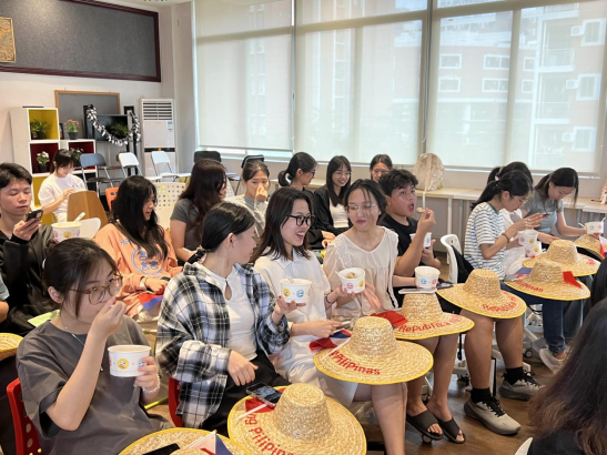 Joshua Cachin带着对家乡和和平的热爱,首先向大学生们介绍了菲律宾国旗上蓝色和红色位置的区别,蓝色在上表示和平时期,红色在上是战争时期的标志。随后,他通过介绍大家不太熟悉、位于菲律宾高山地区的、有着夏季之都美誉的Baguio(碧瑶)小镇,带大家领略了菲律宾独特的民族服装、风俗、饮食以及舞蹈,并带领大家一起学跳了当地的传统舞蹈。