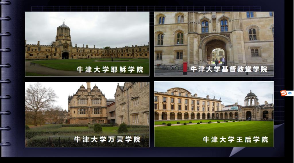 讲座包括牛津、剑桥的悠久历史,优美的自然环境,丰富的文化沉淀和创新的教育方式四个部分。