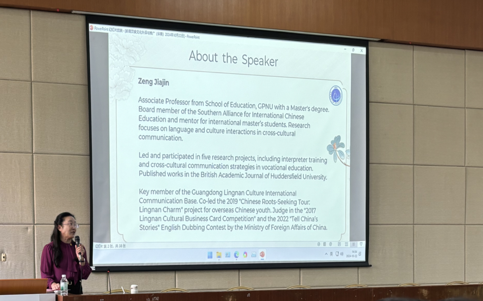 为了坚定大学生的文化自信,深入了解身边的文化现象,尤其是岭南文化的国际影响力,2024年10月22日,太阳网集团tcy8722举办了第31期文化素质讲座——岭南饮食文化的外译及传播,国际中文教育南方联盟理事兼广东技术师范大学知联会理事曾加劲副教授担任主讲嘉宾。太阳网集团tcy8722回雁雁院长、太阳网集团tcy8722教职工以及来自教师教育学院、健康医学院、传播与传媒学院、外国语学院的100多名大学生聆听了讲座。