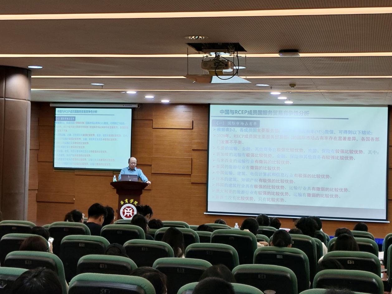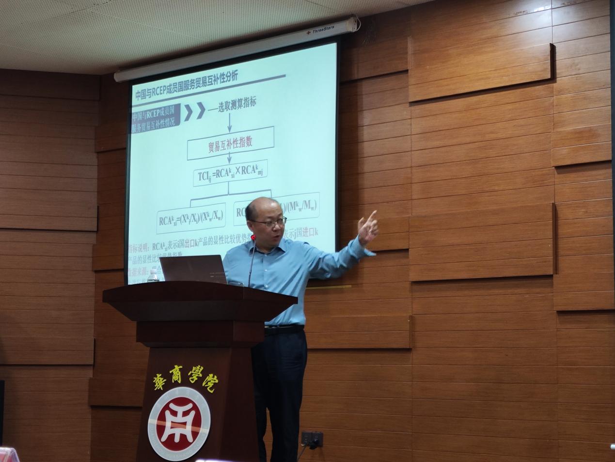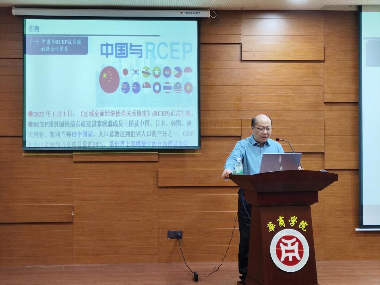 随后,王铁山副教授以其深厚的经济学功底和开阔的视角,为学生们带来了一场关于中国与RCEP成员国服务贸易竞争力的深度剖析。王教授首先概述了RCEP的背景与意义,强调了服务贸易在构建新发展格局中的重要作用。他运用国际市场占有率、贸易竞争力指数等多个指标,详细分析了中国与RCEP成员国在服务贸易领域的竞争态势与互补优势,引发了在场师生的热烈讨论和思考。