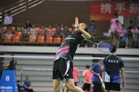 (傅诩恩同学在2021年广东省大学生羽毛球锦标赛比赛现场)