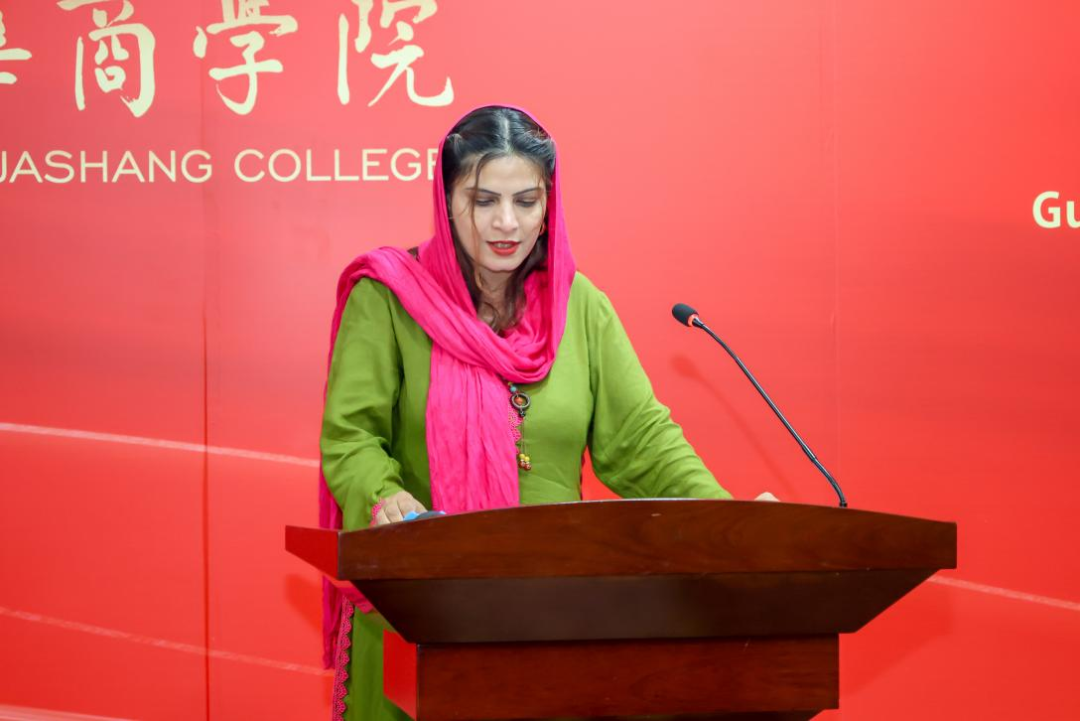 巴基斯坦籍教师代表Aneela Qadir博士在发言中,深情回顾了与华商学院共同成长的四载温暖时光。她动情地表示,华商于她而言不仅是工作单位,更是精神家园。作为教授来华留学生《会计学原理》的教师,她期待来华留学生的课堂能成为知识传播、文化交流与心灵沟通的桥梁。她寄语新生们:永葆求知之心,搭建沟通之桥,锤炼坚韧之志。